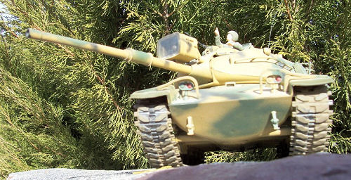 This is the oldest version of the M-60A1. Since the box, decals and instructions were destroyed in a basement flood I can’t comment on the decals or instructions. The plastic was molded in Tamiya’s shade of olive drab. The molding was crisp with no flash. This is the kit with the electric motor, so there are cutouts on the bottom of the hull that can be filled. I say can be filled, because I installed the motor and switches. It drives the cats crazy to have a model chase them. I think it reminds them to stop swatting at the stretched sprue antenna!