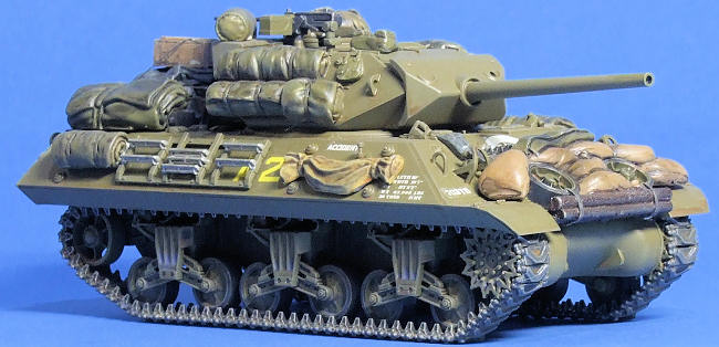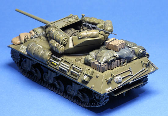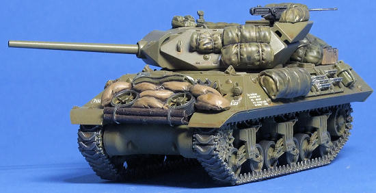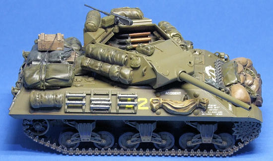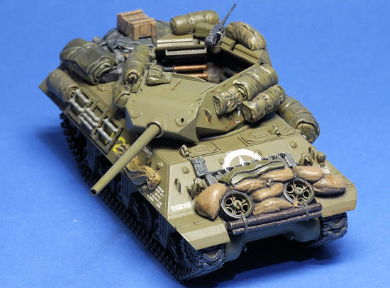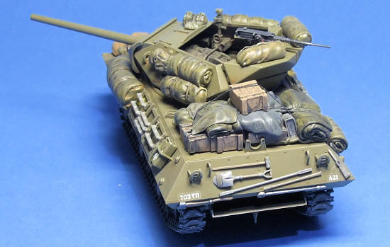 The Legend stowage set includes a front piece adorned with sandbags, logs, spare wheels and track.....typical added protection for this hard-hitting but thin skinned vehicle. A single rear piece includes a tarp-covered assortment of jerry cans, rolls, crates, etc. And then there is a plethora of assorted bags and bed rolls to put wherever. I pretty much covered this M10 with these, and I still have a bunch left over for other projects. Well worth the money.
