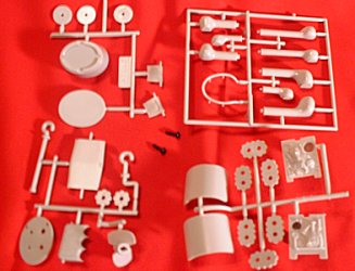 The model of the Yellow Submarine is molded in gray plastic. The hull is in two parts and there is a sprue of additional parts comprising periscopes, screw, motor assembly and wheels. The kit also contains a rubber band powered motor launching the model in a pool or bathtub. The decals are of the various windows and rainbow logo. There are two etchings of characters from the movie that can be views through a porthole when installed. While the model does require paint, the colorful finish would best be achieved with an airbrush. There are no facsimiles of The Beatles in the kit even though they are portrayed on the box top.