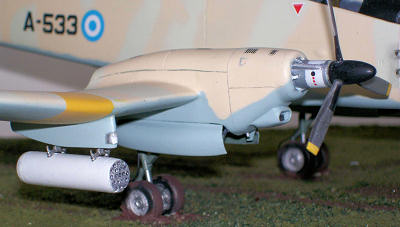 plastic, the pipes with metal)I gave the kit a coat of satin clear varnish. Painted the navigation lights with Future to make them shiny. Painted the two white formation lights behind the top of the tail (a couple of blobs of glue were added first to give them some volume). Added the scratchbuilt brake lines to the main landing gear (2 on each) and then added the wheels.