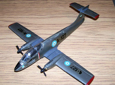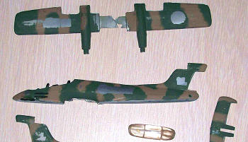 An extremely basic kit with twelve plastic parts, with a very thick clear canopy. No landing gear, air intakes, wrong profile of moveable surfaces and wrong location of internal armament. Wrong serial number (inexistent A-127) and fictitious decals.