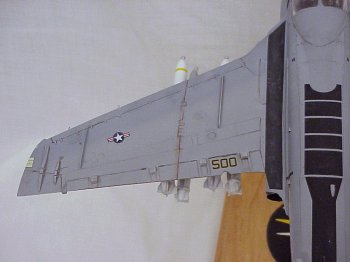 After masking the canopy, I began painting by airbrushing the tail and canopy black. I followed this with white for the intakes. I then painted the base colors using Model Masters Light Ghost Gray (FS 36375) and Dark Ghost Gray (FS 36320). Their enamels are a very good match to the FS colors. Several coats of Future were sprayed prior to decaling, (although I could tell just by looking at the black that I’d probably get silvered decals).