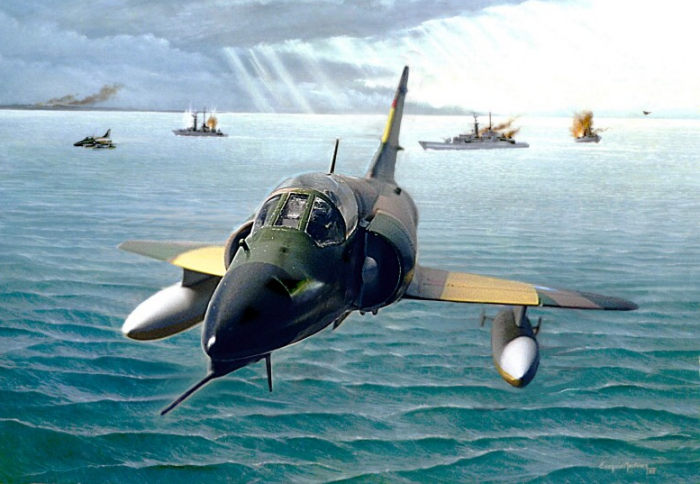 At 14:25 three RN warships started shelling the island. These were HMS Arrow, HMS Alacrity and HMS Glamorgan. As a consequence several missions were sent to attack them covered by Mirage IIIEA/Dagger CAPS. Among all the planes that took part in this air strike, we will center our attention on TORNO flight.