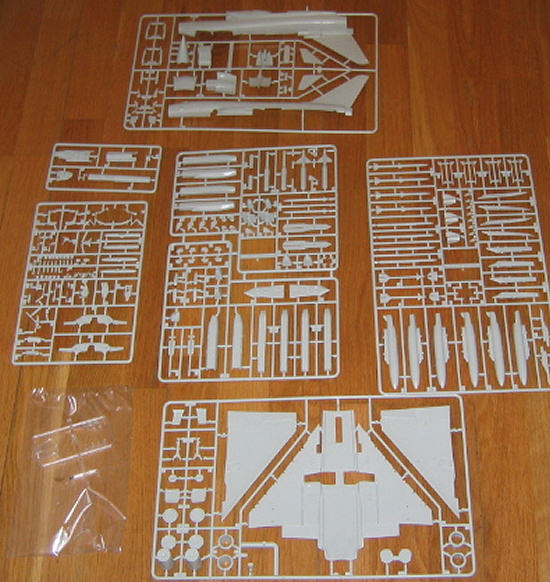 clear plastic bag, containing 6 light grey sprues and 1 with the clear parts