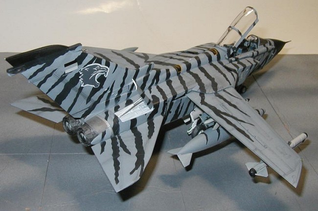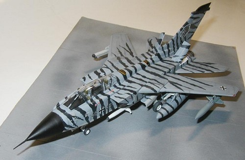 The main gear is particularly fiddly and Cyanoacrylate type glue (super glue) is recommended. The airbrakes do not fit flush, but I think that’s a problem with every Tornado kit. That doesn’t really detract from the kit because the detail inside the well is quite good, so the airbrakes might as well be open. A neat feature is that the canopy fits very well, such that it fits perfectly flush in the closed position and no glue is needed to hold it. Also, it fits well enough to hold itself in the open position without glue. After most of the parts are put on, it’s off to the paint shop.