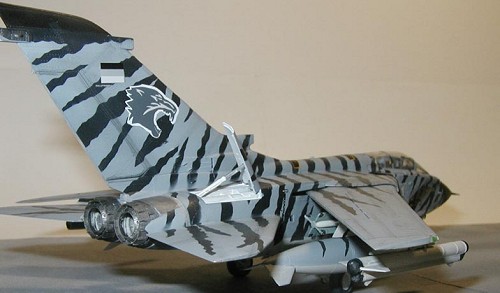 This is a fun kit. Even though it’s in all black and grey, it will definitely stand out in among all the other modern grey jets. The stripes seem like a hard thing to do, but all it really takes is a little patience. Highly recommended for people of moderate skill.
