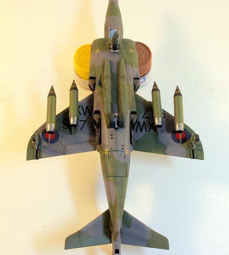 I printed out the pilot’s name from my printer onto clear decal stock. A coat of MicroScale decal coat was then brushed over the decals to seal them. When this was dry, I cut them as close as possible to the design (one large sheet of carrier film on these), and applied them as normal. Finally, Gunze clear flat from a rattle can was used to bring everything back to a flat sheen. Some light weathering was applied using some pastels to dirty up the airframe a little. Photos show some decent wear and tear on these Harriers.
