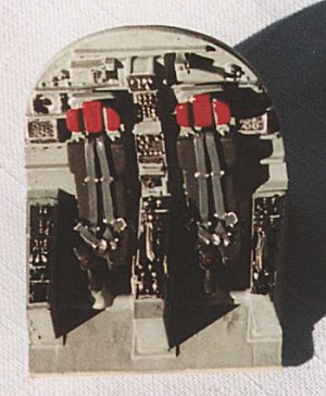 The instrument panel, sidewalls, rear bulkhead and floor pan were painted light grey with the consoles and instrument surrounds painted flat black. Various knobs were painted red and yellow, with the ejection handles painted yellow with black stripes. The individual assemblies were then highlighted to simulate wear and tear by dry brushing with silver.