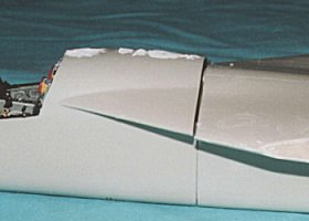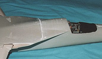 Now the main problem encountered with building the Academy F-111 is the join between the rear fuselage and forward, cockpit fuselage, as shown in the series of figures below. The reason is that there is a significant step between the two subassemblies. I had been forewarned about this and decided to brace the rear with plastic to enable a cleaner join and reduce the amount of filler required. Great in theory, but this proved to be wrong as filler was required to help form a smooth surface – twice! Typical of model construction where you strive to overcome adversity, I had successfully filled and smoothed, and subsequently re-scribed panel lines. I then painted the airframe and proceeded to glue the canopy onto the cockpit. I precariously balanced the model to allow the canopy join to fill, prior to sanding and painting when disaster struck in the form of a small bump on the surface upon which all my hard work rested. The resultant fall of one metre (3 feet for my American cousins) of a nose heavy model (remember the one ounce to one ton remark?) resulted in the fuselage snapping at my so hard worked on joint! Aaaargh! Oh well, back to the drawing board to re-gluing the now jagged join and yet more filler and subsequent sanding and re-scribing of the panel lines. Finally it was ready for the coat of Model Masters FS36118, Gunship Grey enamel. This was to happen a third time but not as disastrous due to the partial separation of the two assemblies.