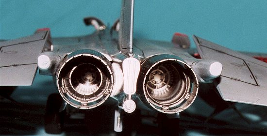 I elected to scrap the tail cone in preference for the aftermarket one from Stephen Thrum’s Scaledown set (SDA48004) and attached it with superglue. I used the Alcad range of metal paints to finish the part. The twin booms, that sit outside the exhaust nozzles, had flare and chaff dispensers added by taking a piece of flat plastic and cutting four square holes into it. The pieces were then attached to the boom and filled to match the profiles. The holes were filled with fine photo etch mesh to approximate the photo references. As an afterthought I elected to fill them with clear glue and paint them smoke. This was after close inspection of another "G" at Amberley RAAF base, where the openings were covered with what appeared to be perspex plates.