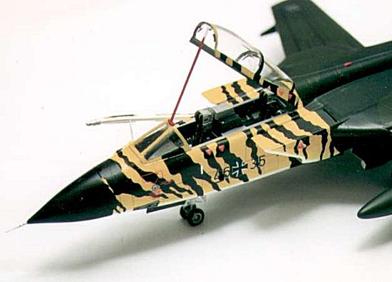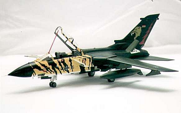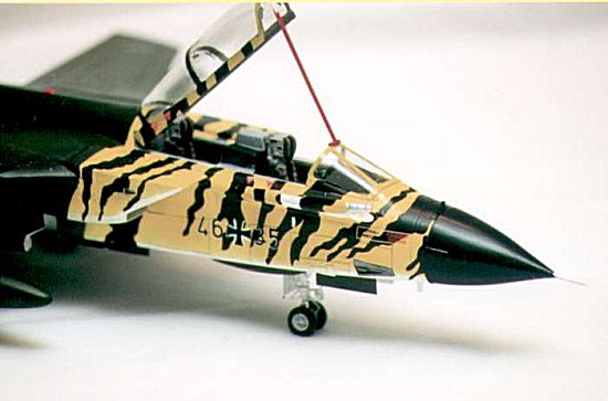 http://www.ping.be/tigersqn/index.html for all the information you wanted to know but were afraid to ask. Gert has been very helpful with my project and has supplied a few facts missing from the decal sheet. The decal sheet is manufactured by PROPAGTEAM, a Czech Republic outfit and distributed by Aeromaster Decals. The set includes decals for a Tornado GR. Mk 1 from 16th Sqn RAF, a Tornado F. Mk 3 of Saudi Arabia Royal Air Force, a Tornado IDS belonging to 50th Stormo of the Italian Air Force and a Tornado ECR from 321 Jabo Geschwader Squadron of the Luftwaffe operating at Lechfeld.I first sprayed the forward fuselage area with Insignia White. This formed the undercoat for the yellow that was to follow. The yellow used was Model Master FS13655, Blue Angels Yellow. The decal sheet calls for Chrome Yellow Med (FS23655) but as the first number refers to the shininess of the paint, with 1 being gloss and 2 being satin, I elected to use the gloss and overspray with satin finish. This colour was sprayed down the fuselage and graded onto the undercoat at the lower edge of the forward fuselage and down the sides of both engine nacelles. The color extended to just behind the cockpit and just in front of the wing fairing at a slight rearward angle to finish immediately forward of the main wheel well doors. The remainder of the fuselage was sprayed in two-tone green camouflage using Model Master enamels, RLM70 Schwarzgrun and FS34079, Dark Green. I sprayed the dark green first and used Parafilm as the masking medium and then sprayed the Schwarzgrun. This was my first use of this product and I was very impressed.