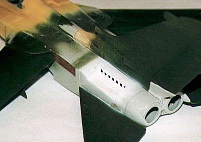 Eduard Photo etch brass (Tornado IDS Exterior 48 –092) was used to cover the sliding portion of the wings along the fuselage. I suspect that this is made of a rubber of some kind as it is referred to as the wing root pneumatic seal, although this is merely supposition. Brass was also used on the area above and below the exhaust ports. Both of the air brakes were up graded with brass and the fuselage recess for the brakes was completely removed and replaced by brass bits. This certainly looks more realistic than the kit’s representation. Both these parts were sprayed with Model Master FS17875, Insignia White and masked off when the fuselage was painted.