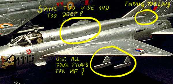 After checking my photos of the `Fishbedit is clear that this situation is present on the original plane as well, the pilots either have the fuel tank or the ventral speedbrake, but never both. I think this is the reason why the `Fishbed has two additional speed- brakes further forward. Another small glitch is that the instructions of the MF version advise you to use only two underwing pylons, which is wrong, since one of the most apparent improvements of the MF over its predecessors was the presence of four underwing stations, of which two were capable of carrying drop tanks. The parts for the additional two pylons are on the sprue, you only have to open up the other two holes in the wing to mount them.
