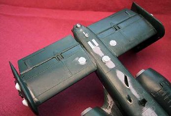 Thanks to a suggestion from a fellow web surfer on the ARC web site, I made the blisters on the bottom of the stabilizers from the clear lenses for the Maverick missiles. The crown of the lens was sanded flat and a piece of square styrene glued on top of it to form the cover for the blister.