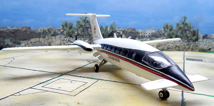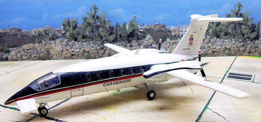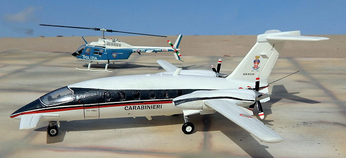 Aircraft was sprayed in Model Master satin white overall. The fuselage and nacelle trims were Compucolor Sea Blue. The color scheme adopted sported the one adopted by the Italian Carabinieri force.