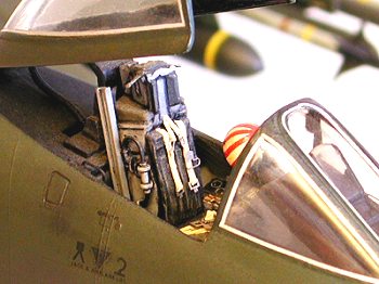 Sad as they were, the kit’s instrument panel and cockpit tub were used, after adding enough details to impart a ‘busy’ look to the office. The Douglas Escapac seat was treated in similar fashion, while the stick was replaced with a modified F-15 unit pirated from the Monogram kit. The completed cockpit was cemented to the right fuselage half while attention was focused on installing the ballast.