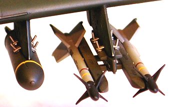 A prototypical ordnance load-out was created and installed using pieces from the various Hasegawa weapon sets and a scratch-built dual Sidewinder launch rail adapter for Station 1. Brass wire pins were used to hang the items on their respective pylons.