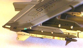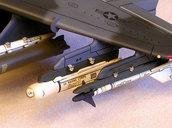 External stores consist of a pair of well-detailed AIM-9L Sidewinders with the correct launch rails, 500-lb Mk 82 Snakeyes, and two Aero 300B fuel tanks (seldom used for anything but ferry missions) molded integral with the inboard pylons.