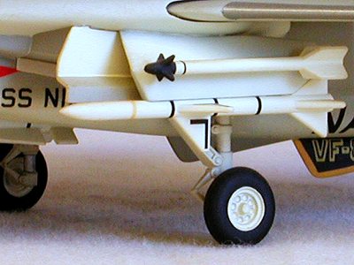 After adding some decal details to the missiles and attaching them I decaled the rest of the model, using the kit-supplied alternate VF-84 scheme. The bare-metal areas on the leading edges of the flying surfaces were simulated with strips of silver decal. When dry, I washed the model thoroughly and sprayed several coats of Testor’s flat lacquer to seal the finish.