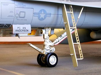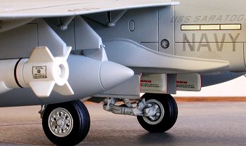 The complex undercarriage is correctly addressed though the nose strut is handicapped by a one-piece molding that oversimplifies many details. The treaded tires are properly sized while the wheel hubs are accurately portrayed. A notable caveat is the arresting hook; the claw is, for reasons unknown, reversed. A simple modification will correct this.