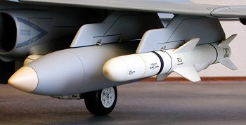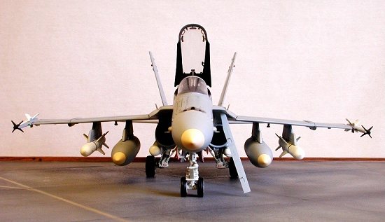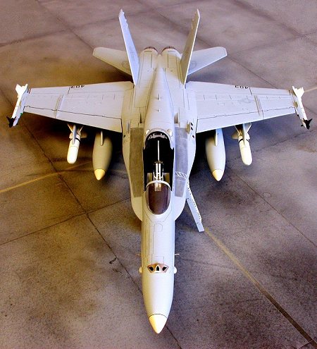 External stores consist of a 330-gallon fuel tank molded integral with a centerline pylon, navigation and targeting pods attached to the fuselage Sparrow missile mounts, a pair of AIM-9L Sidewinders for the wingtips, and four laser-guided bombs to hang from the wing pylons. These weapons are not certified for carriage by the F/A-18 and the pylons to which they attach are totally bogus.