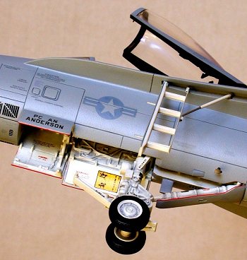 The various scoops and vents were drilled out and baffled to prevent ‘see-through’, then I used photo-etched grills from an OOP Trimaster set for the details present on the prototype. Oil drain tubes under the rear fuselage were replicated by short bits of hypodermic needle. Position lights were installed in the appropriate locations using colored Lexan, then I removed the ladder well area under the portside LEX.