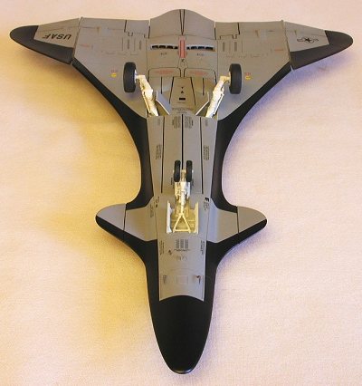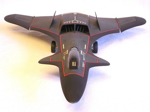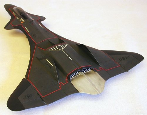 The seemingly speculative design affords a relatively conventional parts layout with large top and bottom fuselage halves featuring integrally-molded main wing structures, separate fins and outboard wing panels, and undercarriage components borrowed from other existing aircraft. A rotating weapons bay door, a la F-101B Voodoo, mounts a two-piece “stealth missile”.