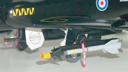 The undercarriage, undercarriage doors and underwing ordinance were then attached without too many problems and my Hawk was completed. Finally, I added some Remove-Before-Flight tags to add some more visual interest, which I made after reading the excellent “how to” article from the tools-n-tips section of the Aircraft Resource Centre web site. The NATO style RBF tags are provided on the Mike Grant decal sheet.