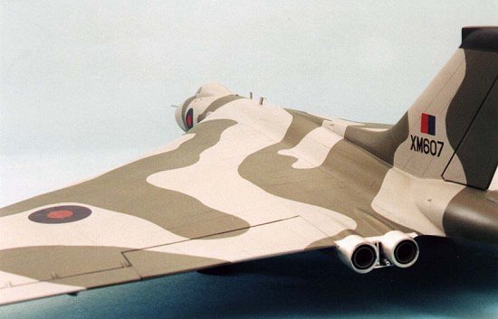 I chose to do XM607, which participated in the first Black Buck mission. A few queries on various modeling discussion boards resulted in nearly instant responses from Vulcan experts on the proper colors and markings. This is what is so great about the on-line world – you can ask a question and get numerous helpful answers. As mentioned above, XM607 was painted with a disruptive camouflage scheme of Medium Sea Grey (matched to FS 36270 by Urban Fredricksson) and RAF Dark Green (matched to FS 34079) over Dark Sea Gray (matched to FS 36173). I used Model Master Acryl paints for the upper surfaces and the undersides got sprayed with Polly Scale US Gunship Gray, lightened with a bit of flat white to match the FS 36173 chip I had. The demarcation lines are all hard, so I used drafting tape for the considerable masking required. I placed the tape on the model, drew the camouflage pattern with a pencil, took the tape off and placed it on a piece of glass, and cut the line with a sharp X-acto knife. Then the tape was placed back on the model and the color sprayed. While slightly tedious, this worked very well. The shrouds surrounding the exhausts were painted with Testor Metalizer Aluminum. Since the windows are tiny and oddly shaped, I used blobs of white glue to seal them before painting. When done, I popped off the glue with a toothpick.
