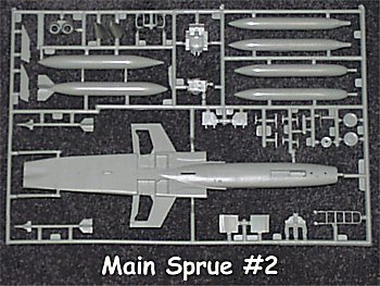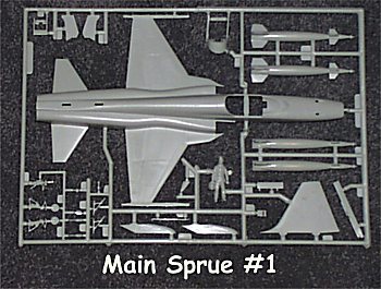 Even though the the plastic looks gray in the picture, it is actually a very light blue/gray color. The are 28 piece on the first main sprue, and 36 on the second main sprue. There is a separate clear sprue that is individually bagged, and contains the canopy, windscreen, and HUD glass. For a 30 year old mold, there is relatively little flash, but some warping, and sink holes in the wings.