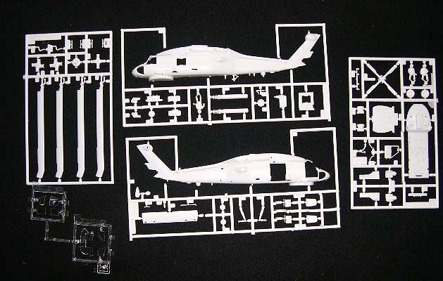 Inside the box are 66 parts on five sprues, one clear, the are moulded in soft white plastic, no flash. It is a variant of their UH-60 series with a different fuselage, the windows are placed different from the UH-60 and there are all kinds of sensors and a radar moulded in the main body parts. The fit is good like we expect from Hasegawa. The detail is engraved, but some places are still raised, the surface detail isn’t accurate, a lot of panel lines are missing and all the rivets are missing (that’s one thing I love about Revell's Sea King), but what to expect from a kit out of the eighties. For the interior detail is the superb Eduard set needed, the only thing nice about the inside are the try figures, they are different from each other. The Eduard set is needed anyway because the kit lacks detail everywhere.