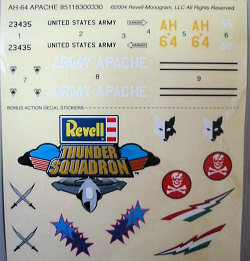 Decals consist of peel and stick stickers for a generic US Army Apache. Extra stickers are supplied that are not part of the main markings but are intended for the child modeler to put anywhere he/she wants.