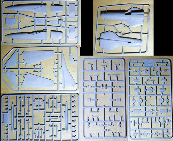Six dark grey sprues with 73 parts, clear sprue with one-piece canopy &