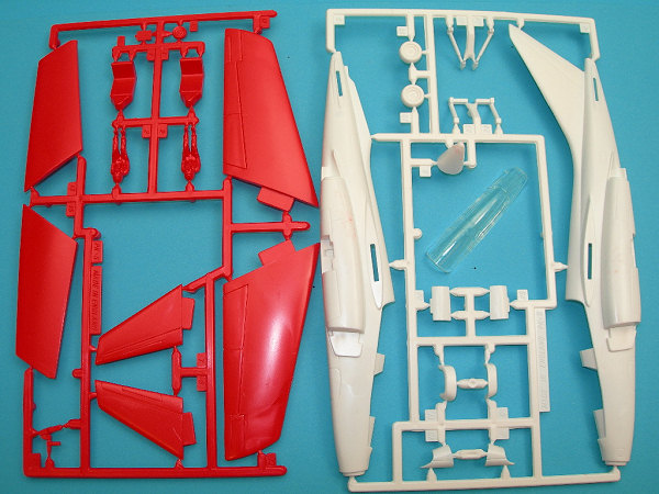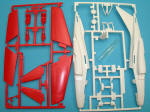 This kit is cleanly molded in dazzling white and red plastic as this is the basic colours of the French decal option. The 27 parts has engraved panel lines and unlike some of their later kits, these are OK. A clear one-piece canopy completes the moldings.