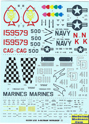 2 markings, 1 for the U.S. Navy VA-196 “Main Battery” 550/NK (BuNo. 159579) and the other one a Marines VMA(AW)-522 “Hawks” 411/ED (BuNo 161111) are included. The VA-196 one is a CAG bird that features a three tone camo of Neutral Grey, Dark Ghost Grey and Light Ghost Grey with a striking black tails with colorful markings. The Marine one is in the standard three tone camo of Neutral Grey, Dark Ghost Grey and Light Ghost Grey. The only fault is that the stencil are anemic but both the stencil and extra markings are now available so you have your third party sources.