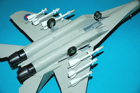 U: You know, for a guy with girlfriend problems, you seem to be in excellent spirits. Anyway, I used Humbrol 140 Gull Grey on the radar cone and the electrical surfaces, Humbrol 127 Light Ghost Grey on the wheel bays and Humbrol 131 Green on the wheel rims. The antiglare surface in front of the windscreen is flat black, so I used the always reliable Humbrol 33. The exhausts were painted with Humbrol 27004 Polished Gun Metal and dry-brushed with Humbrol 27003 Polished Steel to bring out the details. I then polished them lightly with cotton buds. For all this partial painting I used masking tapes and liquid Mascol, in order to achieve sharp edges and smooth finish. It’s always an exciting task, given the danger of lifting color when unmasking, or infusing the underlying color, etc. Thankfully, everything went fine. The aircraft was left for a few days to dry. The last thing I did was apply gloss hagiography varnish in order to prepare the surface for the decals