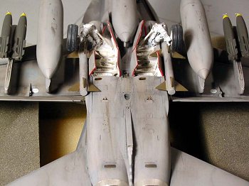 3 drop tanks, 2 sparrows, 2 sidewinders and 4 Snakeye’s from my research was a realistic weapons load for a Balkans mission so there were placed in their respective positions. The snakeye’s came from a Hasegawa weapons kit.