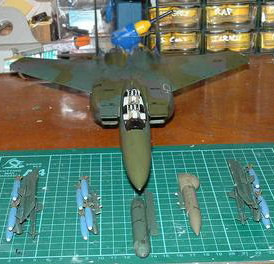 Finally the 10 500Lb bombs were a mixture of some from Hasegawa’s Weapons Set A and some from the spares box. As they were practice bombs I removed the fuses. The tail fins were painted glossy OD and for the main body I used Humbrol WWI blue which I find a good enough match for practice bomb blue. The completed hanging bits can be seen here before attaching to the kit.