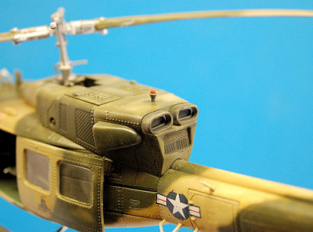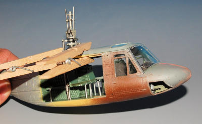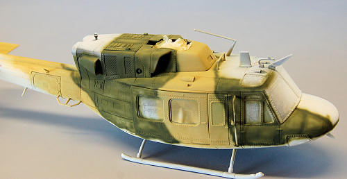 I have actually painted helicopters in the field, and we would spray an outline with rattlecans, and then come back with a high-volume-low-pressure paint unit (HVLP) and fill in, which left quite a lot of faded bits, especially after a rainfall or two. Replicating this effect was fairly easy using a detail Hansa airbrush, and filling in with a Badger Hybrid.