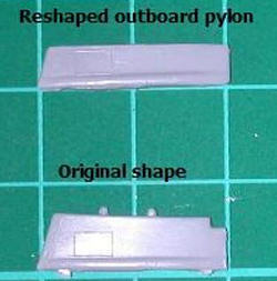 The canopy is a terrible fit, needing some careful filling and sanding to blend in around the rear. This is made more difficult by the canopy frame being moulded as part of the fuselage, which leaves no room for error when sanding. The outer wing pylons need re-shaping, as they are too deep and have a step not present on the real thing. I sawed the stepped portion off, but the proportions are still not quite right. The inboard pylons are also too deep.