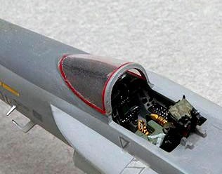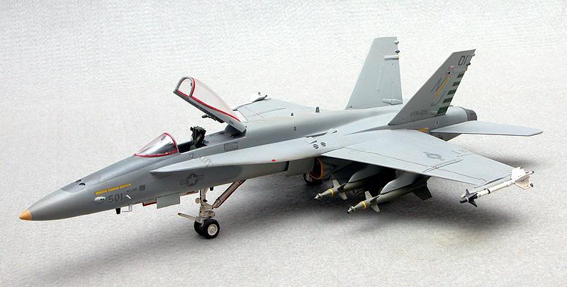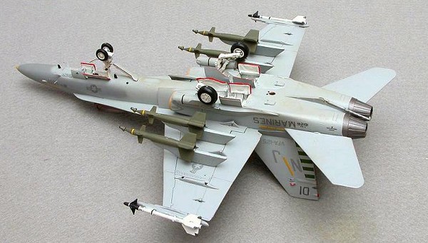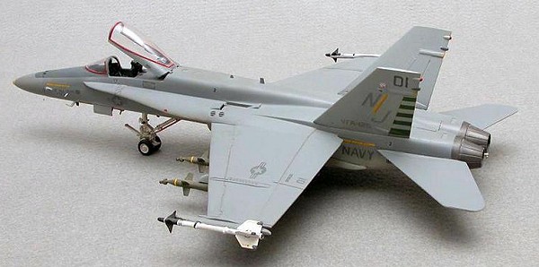 The Monogram kit, though dated, is still a great kit. It has over 90 pieces of gray styrene, sharply molded and free of flash. Detail is excellent, but the kit has raised panel lines, a testament to it’s age. The cockpit is very well represented. Decals were sharply registered. The wheel wells are molded into the fuselage but are well detailed. Landing gear accurately depicts the complex nature of the Hornet’s landing gear. The canopy is inaccurate in shape, however. Due to the molding process, it has straight sides instead of “blown sides”. All in all, though, it is a great kit and the price is considerably less than that of the Hasegawa kit. It comes with laser guided bombs and Sidewinder missiles. A laser designator and FLIR pod also comes with the kit. There is an optional position canopy and speed brake. I chose to leave the canopy open and the speed brake closed. The exhaust “turkey feathers” are a little simplified.