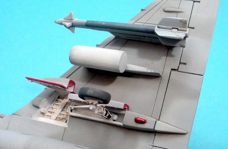For underwing stores, the Italeri kit acted as a source. Both the pylon mounted rocket pods and centerline tank was used after cleaning up and some minor detailing. Added detail for the pods consisted of adding the missing sway braces from .010” card and eight .028 x .010” discs. The tank had some side panels made from .005” card, and a filler cap made from Plumbers Tape. For the outer wing Sidewinder pylons, Italeri supplied the main part, with a modified launcher coming from a Hasegawa F-16 kit. The excellent late model Sidewinder comes from an updated sprue from a Revell F-16 kit.