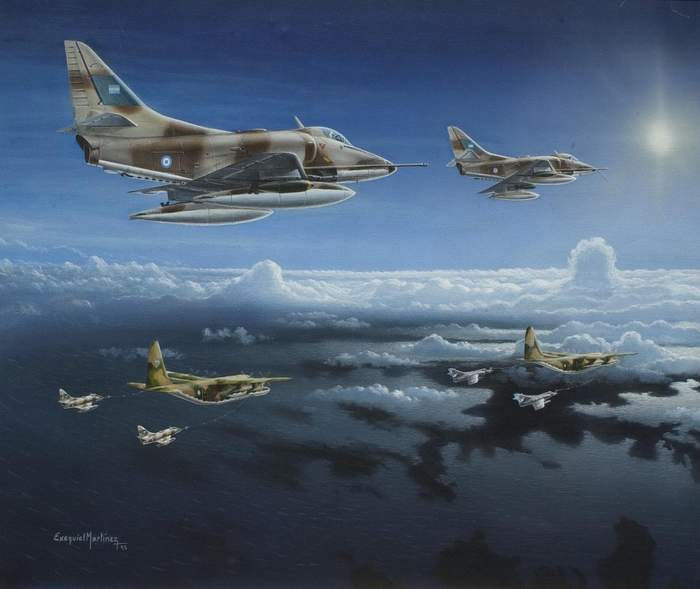 May 12: TC-69 and TC-70 flew missions to refuel the A-4Bs that attacked HMS Glasgow (hit and put out of combat) and HMS Brilliant. TC-69 was flown by Vicecomodoro Litrenta and crew.