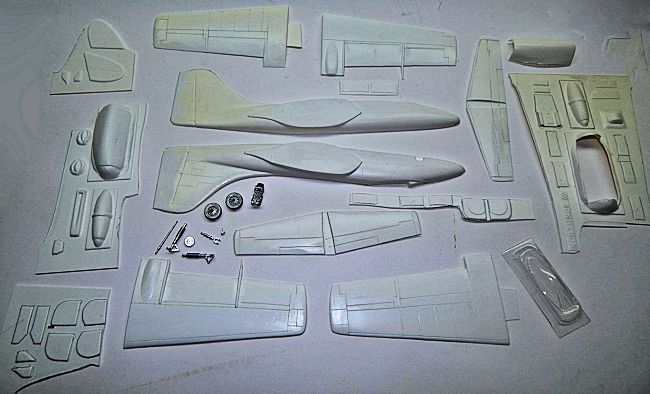 kit components as fuselage halves, wing and tail plane parts, engine nacelles,