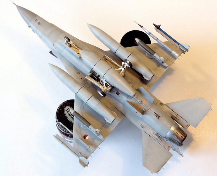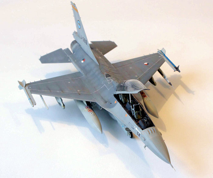 The standard NATO F-16 scheme is the early one in FS 36375/36270/36118 (USAF machines have dropped the 36375; most present day European F-16s are painted in the US, where sometimes the wrong scheme is applied –there is at least one RNoAF –“299”- recorded in the American scheme). I used Xtracrylixs over a heavy preshading; a postshading in a lighter shade followed, and a last pastel powder dusting after the final matt coat.