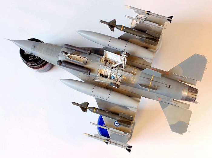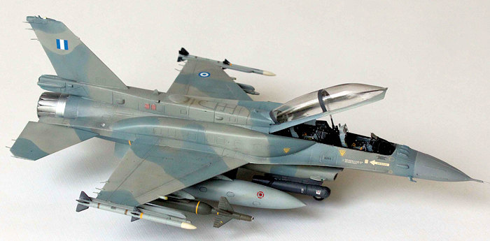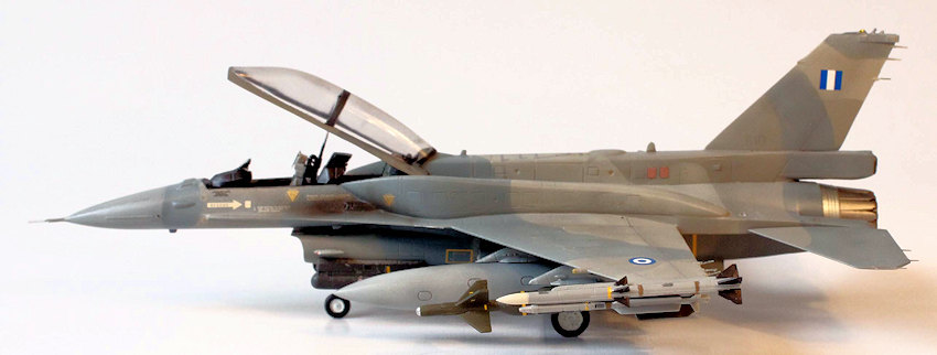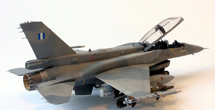The kit comes with both the AN/ALQ-13/14 combo used by the Greeks and the Sniper XL used by the Poles (a multi-piece affair); however it only comes with the IRIS-T used by the former (the latter uses the AIM-9X) Modern jets are seldom seen with full armament; nevertheless, I chose to fit the GBU-24 LGBs and the big tanks provided. The undersurface pylon I left alone (the usual tank carried there is not included; I guess it is made redundant with the CFTs and big underwing tanks) Instructions show an AN/ALQ-28 LITENING, but, exception made of the decals, it is nowhere to be seen.