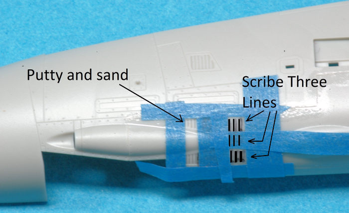 Now that I have the required changes identified I can proceed with construction. I followed the Tamiya instructions just making the following modifications based on my colors and markings (decal) selection. I used Furball 4808 Colors & Markings of USN Tomcats Pt 1, F-14A decal for an F-14A from VF-32, with BuAer 159016 in 1983 markings. It is a block 75 airframe based on the BuNo listing in the reference book Danny Coremans uncovering the F-14A/B/D Tomcat DACO Publications released 2006. The first fold-out drawings section by Willy Peters has the BuNo and block number list. It was never converted to an F-14B or F-14D. It used the seven (7) grill vent series and has the tail stiffeners. I converted the kit part B18 using some Tamiya putty and masking tape. I puttied some sections, sanded them with a tri-stick and using a scriber cut the required extra vents. The kit now had the one big change I wanted to add before continuing in its construction. See photo for the modification process. There are now cast resin conversions available from Steel Beach to address the gun vents you might need if scratch building is not for you.