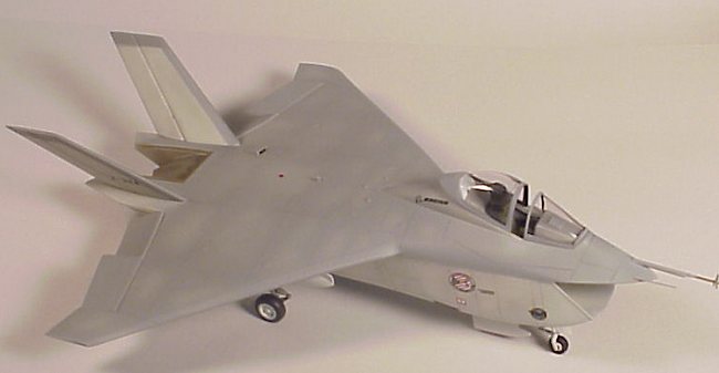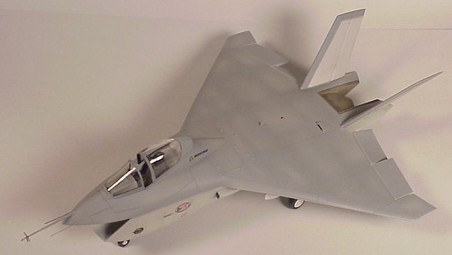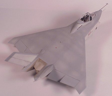 Future wax and Testors flat, the perfect combination. Seal those decals down good and hide the irregularities in the paint surfaces before the flat coat. Pitot tubes and probes get stuck on dead last as they would surely get lost and broken if put on sooner. The canopy is dead solid perfect and clear, even though it was scooting about in the box when I opened it. There you or I have it! A replica of a cool looking X plane. If I was the US government, and in fact I guess in some small way I am, I'd give this X the nod for production, just because it's innovative and a serious looking plane.