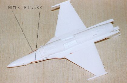 The kit includes options for aircraft No's 1 and 2, whichever you choose the colour is white with various other trimmings-i chose A/C 2 with orange and blue trimming and the black nose radome. The model was first sprayed with Tamiya gloss white-first couple of coats quite thick and then very heavily thinned to give a smooth finish-the trick here is to drop the pressure and literally flow the paint onto the surface without getting runs. With the paint thinned anything up to 95% with alcohol if it looks like the detail is being obscured remember that within a couple of minutes nearly all of what hits the model will evaporate and detail will be preserved along with a very smooth glossy white finish. This paint must now be left for as long as you can to set up before any other painting is done on the main airframe. I used this break to deal with the little bits like wheels and weapons. After a day or two i was ready to commence painting the trimming. When applying bright colours over white i always mask everything that is to remain white-reds, yellows and oranges can find there way onto the white very easily and give it a horrible tint so better safe than sorry- curiously with black or grey onto white this does'nt seem to be a problem. Wing and tail tips were sprayed with Extracolor international orange and the spine was done with Humbrol 15 (midnight blue). This was a trial! i had one of those unlucky spells-the airbrush clogged, lumps were sprayed through it and i ended up knocking an open tin of blue off of the table. When it hit the floor i was treated to a mavellous display of fluid dynamics- the result was one ruined pair of jeans, a midnight blue cheek and blue absolutely everywhere over the floor-took me half an hour to clear up and then i knocked the airbrush colour cup over! This scene would have made Frank Spencer look efficient! In the end however i prevailed and on the blue went, just goes to show- the best laid plans etc.! I had masked out the red decal areas for the belly stripe and cheat line and sprayed them blue as well-seemed easier than trying to mask the areas of the model in this case. With the anti glare panel and radome painted Tamiya gloss black and the various antenna etc. painted black decalling could commence.