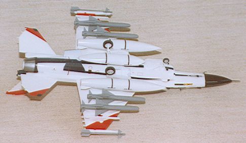 The Hasegawa kit represents the single seater (a seperate forward upper fuselage deals with this aspect of the design, to make room for a twin seater later)and comes on 13 white and one clear sprue. Also included are some poly caps to be inserted in the fuselage prior to assembly to allow the tailplanes to be push-fitted and subsequently to move. Overall detail is all engraved and very refined (as we would expect from Hasegawa), though some of the lines on the drop tanks are raised for some reason. . . Stores included are two of the large 600 gallon tanks as seen on Israeli F-16's, one 300 gallon centreline tank, 4 ASM-2 anti-ship missiles and 2 AAM-3 air-to-air missiles. The decal sheet is extemely comprehensive and contains markings for the first two prototypes, including just about every piece of red trim possible for #1 (tho' i would still prefer to mask and spray these areas-but at least you have the choice!